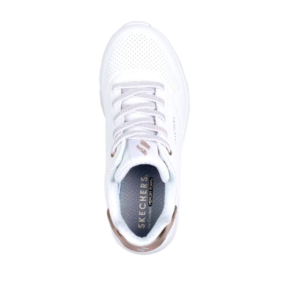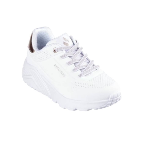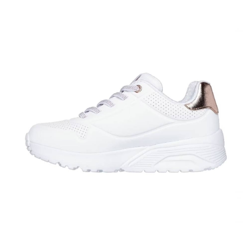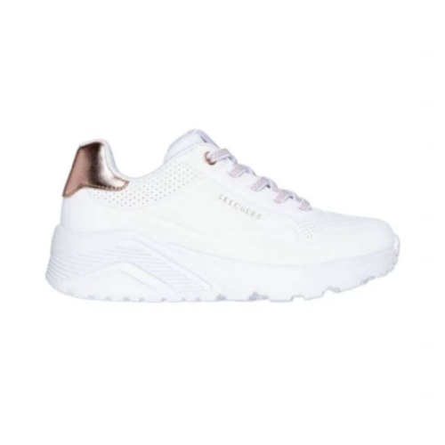 Añade un toque de brillo a cada paso con las Skechers Uno Lite - Gen Chill. Esta deportiva de estilo fashion destaca por su diseño impecable en color blanco, realzado con sofisticados detalles en oro rosa que la convierten en el complemento perfecto para un look urbano y actual.