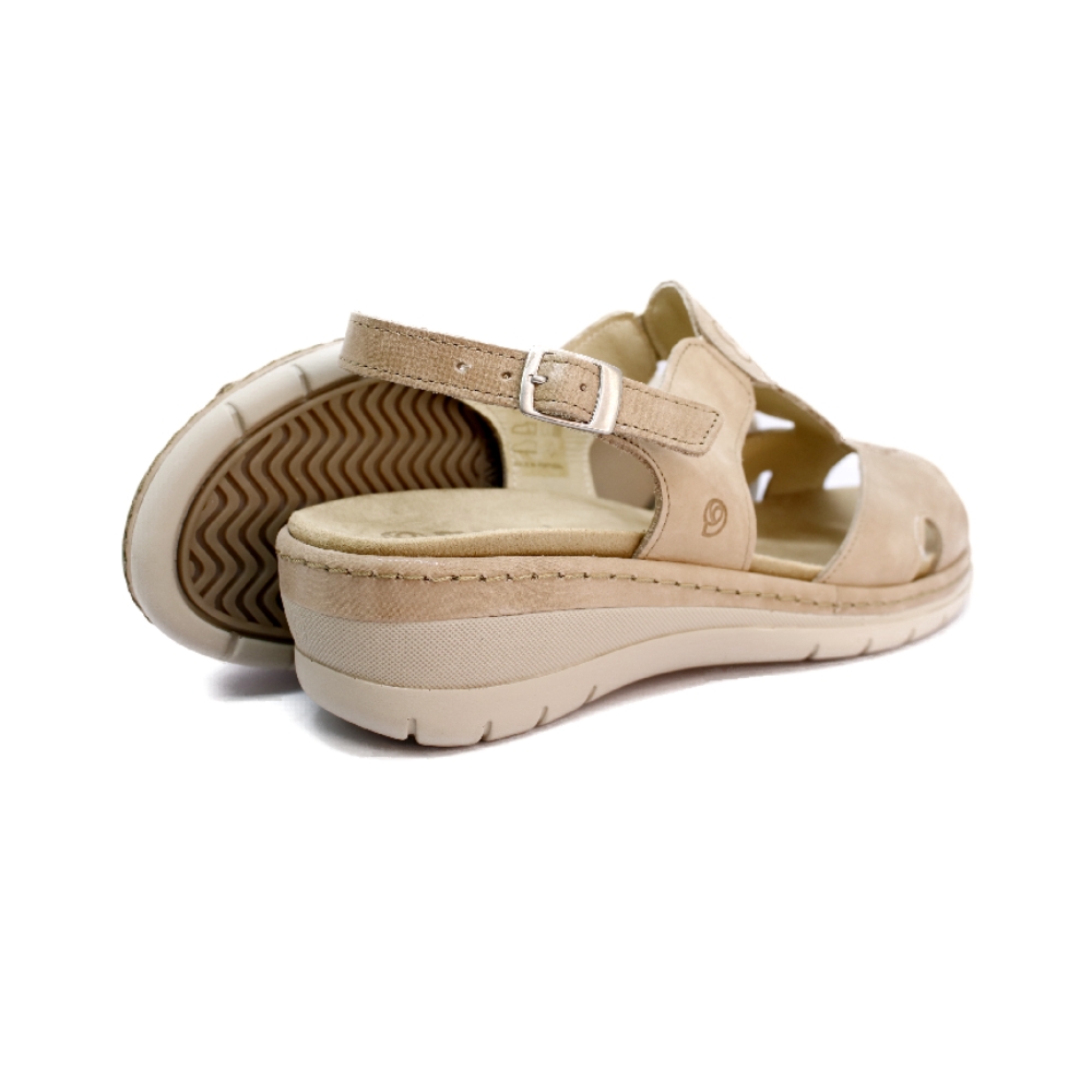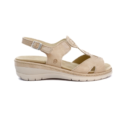 Sandalia de mujer realizada en piel beige con detalles de flores serigrafiadas en un tono más oscuro. Gracias a su diseño, sujeta perfectamente el pie. Incorpora plantilla extraíble que pemirte la adaptación de cualquier plantilla ortopédica. Suela de caucho en dos tonos con una altura de 4 cm.