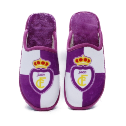 Zapatillas de casa chinela del Real Jaén de la marca Suaveflex. Fabricadas en textil muy suave con pelo. Plantilla extraíble. Piso cómodo de goma muy flexible.
