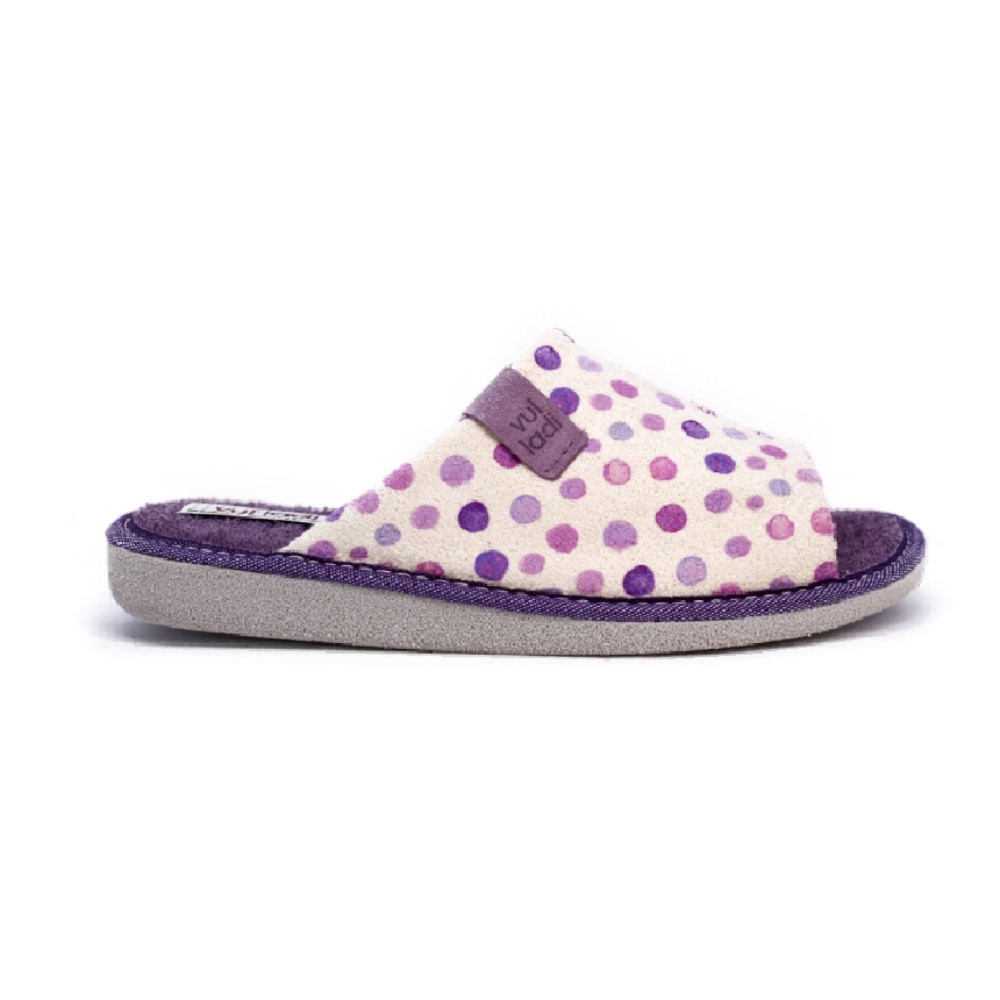 Esta zapatilla de casa para mujer, caracterizada por su estampado de lunares o topos en tonos lila, es el modelo Pala Topos Lila de la marca española Vul-ladi. Se trata de una chinela de puntera abierta diseñada para la temporada de primavera/verano, destacando por su comodidad y materiales suaves.