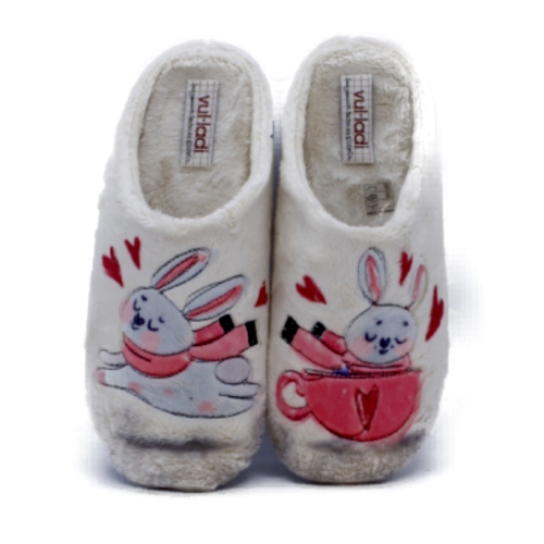 Zapatilla de casa destalonada para mujer, realizada en tejido suave y calentito. Dibujo de Conejito ambos pies. Suela vulcanizada de caucho flexible y antideslizante. Fabricado en España por la marca Vul-ladi.