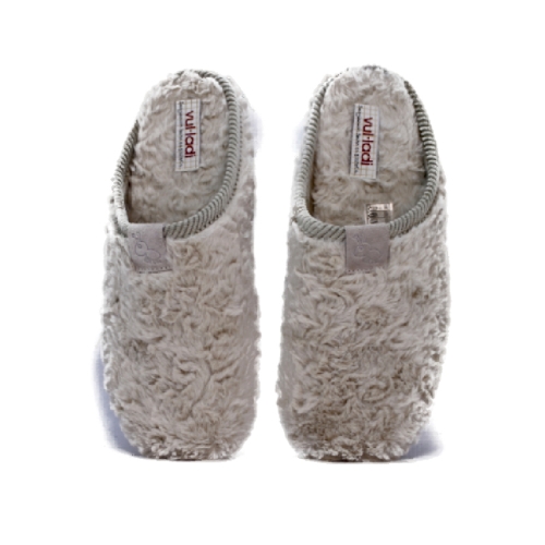Borreguito de Pelo Largo: Confeccionadas en un tejido de pelo largo y rizado en un color gris perla (greige), estas zapatillas ofrecen una calidez inmediata y un tacto suave y envolvente.