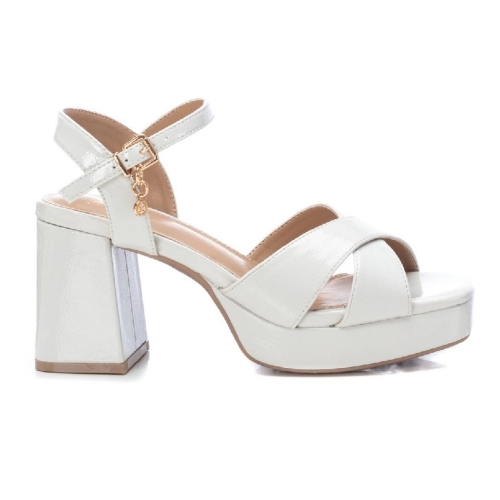 Sandalia elaborada en material sintético estilo charol en color hielo. Cierre de hebilla. Tacón ancho de 8cm aprox. y plataforma de 2cm aporx. Este modelo ha obtenido el certificado vegano por la organización mundial PETA (Organización de los derechos de los animales).