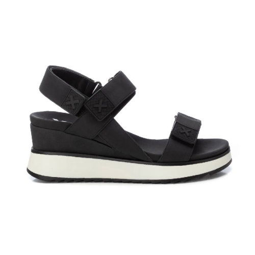 Sandalia de mujer con cuña, de la marca Xti. Fabricada en material que imita la piel, se convertirá en uno de tus esenciales de esta temporada.  Cierre mediante tira adherente. Planta bios. Cuña de 7 cm con suela de goma antideslizante. Este modelo ha obtenido el certificado vegano por la organización mundial PETA (Organización de los derechos de los animales).