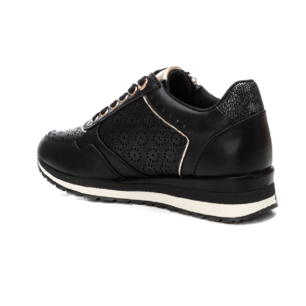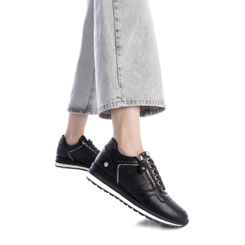 Zapatilla casual de mujer, de la marca Xti. Está fabricada en material que imita a la piel. Bonito troquelado en el lateral. Cordones al tono y cremallera con función en el lateral. Cuña bicolor con suela de goma antideslizante. Con plantilla extraíble. Este modelo ha obtenido el certificado vegano por la organización mundial PETA (Organización de los derechos de los animales).