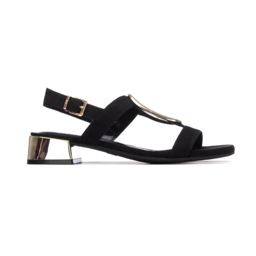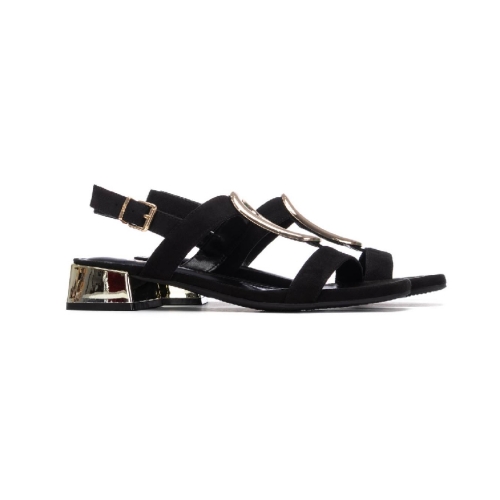 Diseño Elegante y Minimalista: Confeccionada en material sintético de alta calidad con un acabado aterciopelado en color negro, esta sandalia presenta una estructura de tiras finas que estilizan el pie.