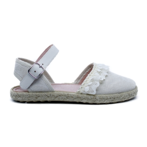Elegante y delicada alpargata diseñada especialmente para comuniones, pajes, ceremonias y eventos de verano. Fabricada con materiales ligeros y transpirables, presenta una combinación perfecta de comodidad y estilo. Su acabado en tela color blanco con detalles de encaje aporta un toque romántico y sofisticado. La suela de esparto añade un aire tradicional, mientras que la correa ajustable con hebilla asegura un ajuste perfecto y cómodo para todo el día.