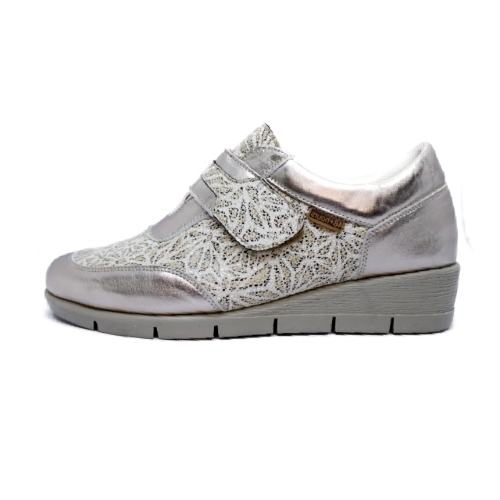 Confortable zapato de mujer realizado en suave piel y tejido de de licra estampado. Una combinación alegre  para tus looks primaverales. Suela de caucho muy flexible y ligera. Plantilla de gel extraíble. Se ajusta perfectamente gracias al cierre de velcro.