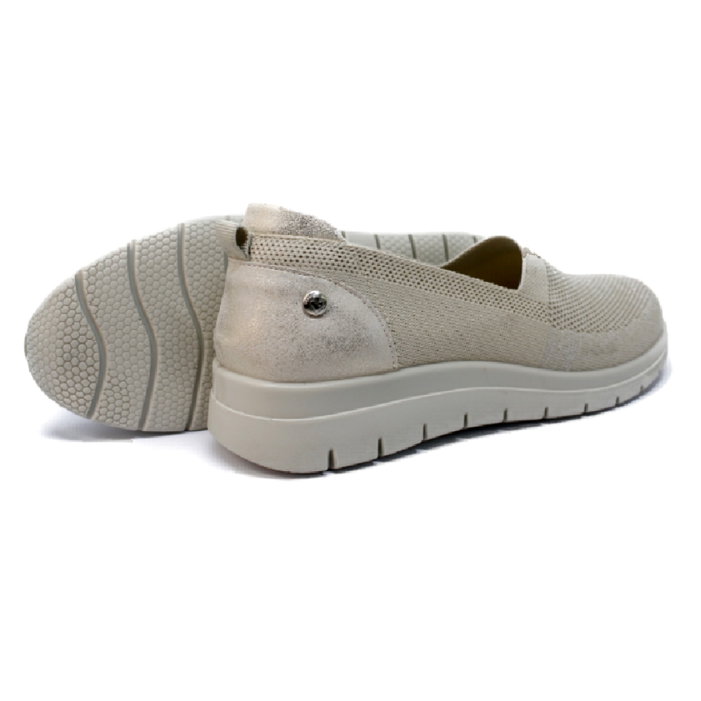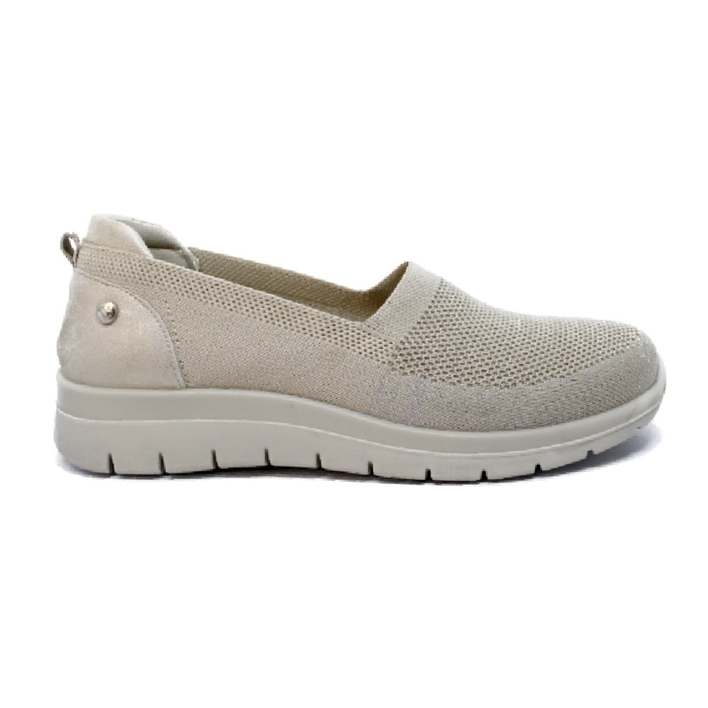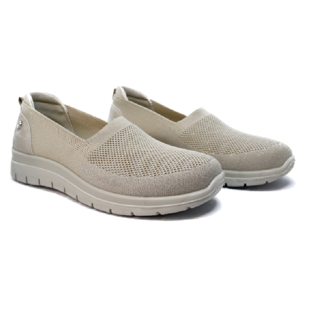 Zapato cómodo de mujer estilo casual. Fabricado en textil tipo calcetín. Suela de goma flexible y ligera. Plantilla acolchada y extraíble. Disponible en color beige. Modelo ligero y transpirable que ofrece máximo confort para uso diario.