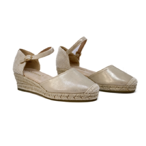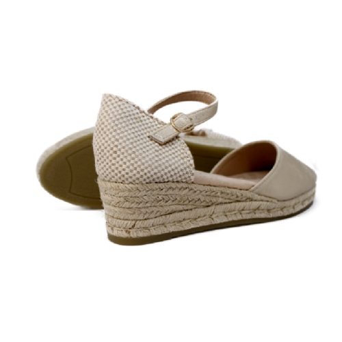 Sandalia valenciana de la marca Amarpies para mujer, realizada en material textil y pulsera de piel con hebilla ajustable que facilita su calce y ajuste al pie. Planta de piel acolchada de gran comodidad y suavidad en la pisada. Cuña de esparto y suela de goma para mayor agarre. Medidas: cuña 5 cm