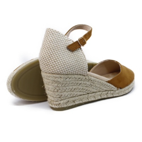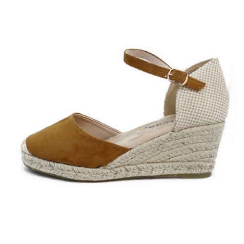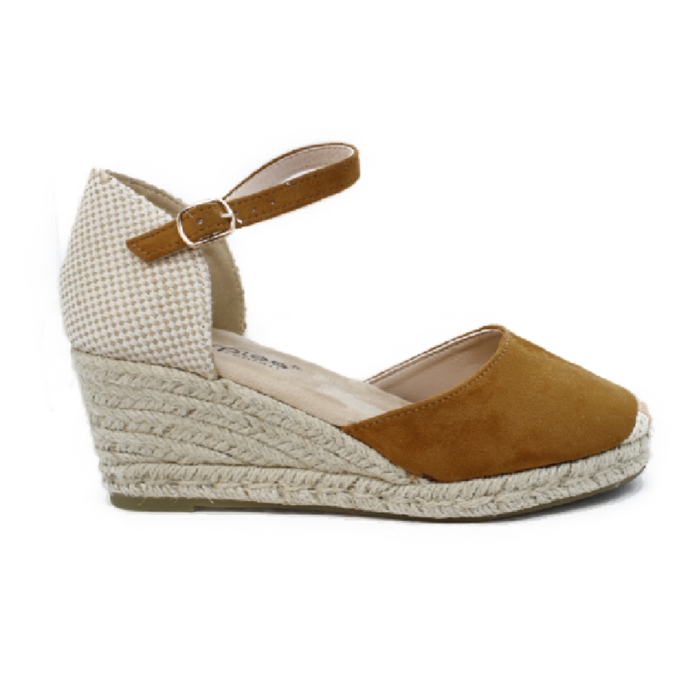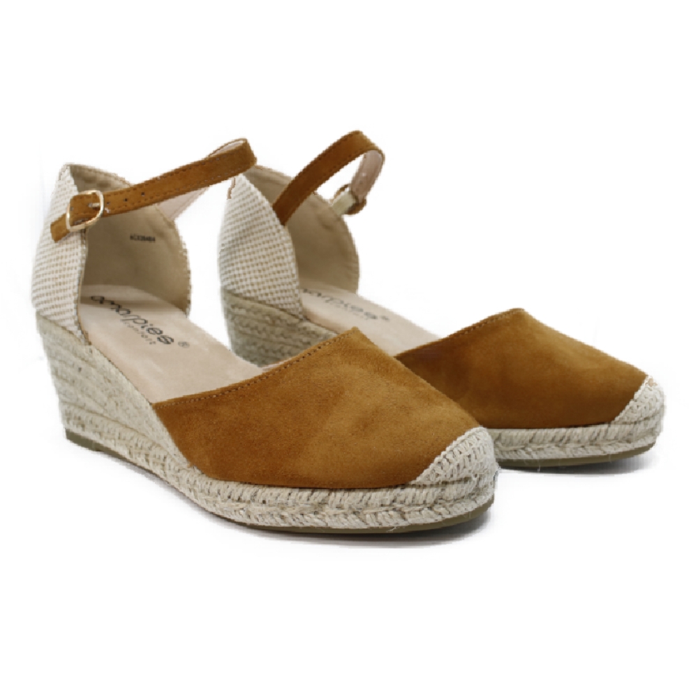 Sandalia valenciana de la marca Amerpies para mujer, realizada en material textil y pulsera de piel con hebilla ajustable que facilita su calce y ajuste al pie. Planta de piel acolchada de gran comodidad y suavidad en la pisada. Cuña de esparto y suela de goma para mayor agarre. Medidas: cuña 7 cm