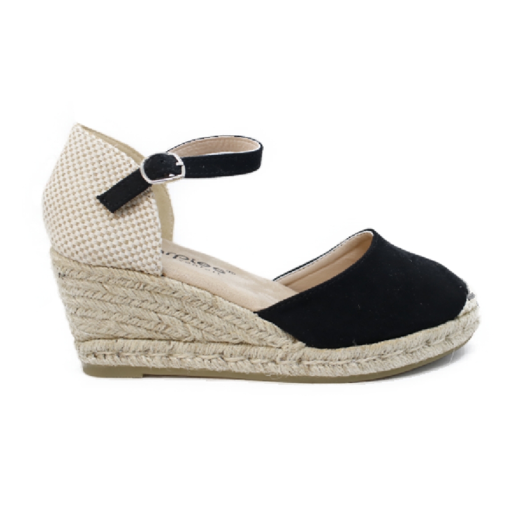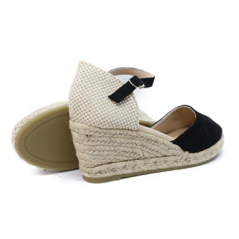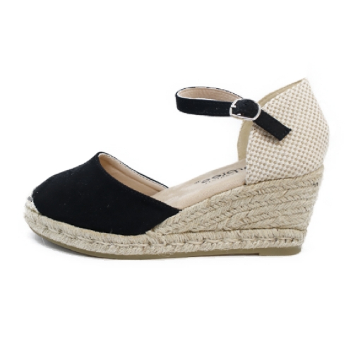 Sandalia valenciana de la marca Amerpies para mujer, realizada en material textil y pulsera de piel con hebilla ajustable que facilita su calce y ajuste al pie. Planta de piel acolchada de gran comodidad y suavidad en la pisada. Cuña de esparto y suela de goma para mayor agarre. Medidas: cuña 7 cm
