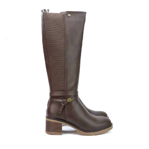 Bota amazona realizado en suave material sintético  que repele el agua. En su parte posterior lleva una tira ancha de tejido elástico que permite ajustar la anchura a gémelos anchos. Suela de caucho antideslizante con un cómodo tacón de 4 cm. Adorno de hebilla y tira de cuero.