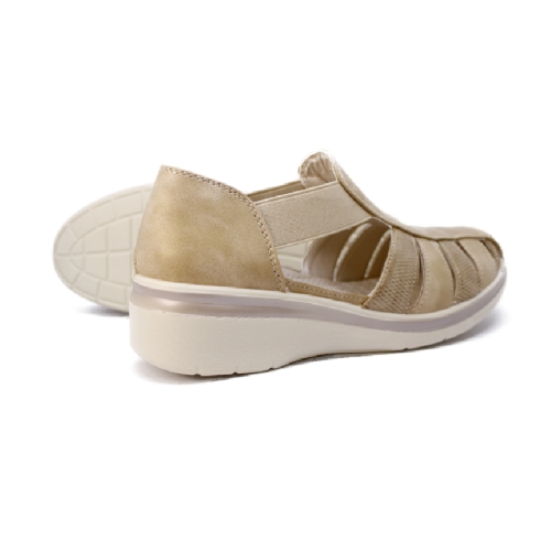 Zapato de mujer tipo cangrejera con aberturas laterales para mayor transpirabilidad. Diseño con tiras elásticas que garantizan un ajuste cómodo y seguro. Fabricado en piel sintética de alta calidad, con suela de goma ligera y flexible para una pisada confortable. Color arena, perfecto para combinar con cualquier look veraniego. Cuenta con plantilla acolchada y extraíble, ideal para quienes buscan comodidad durante todo el día. Su pequeña cuña de 4 cm proporciona una altura sutil sin renunciar al confort.