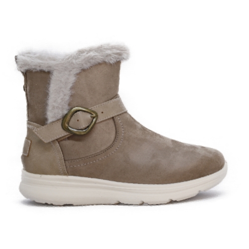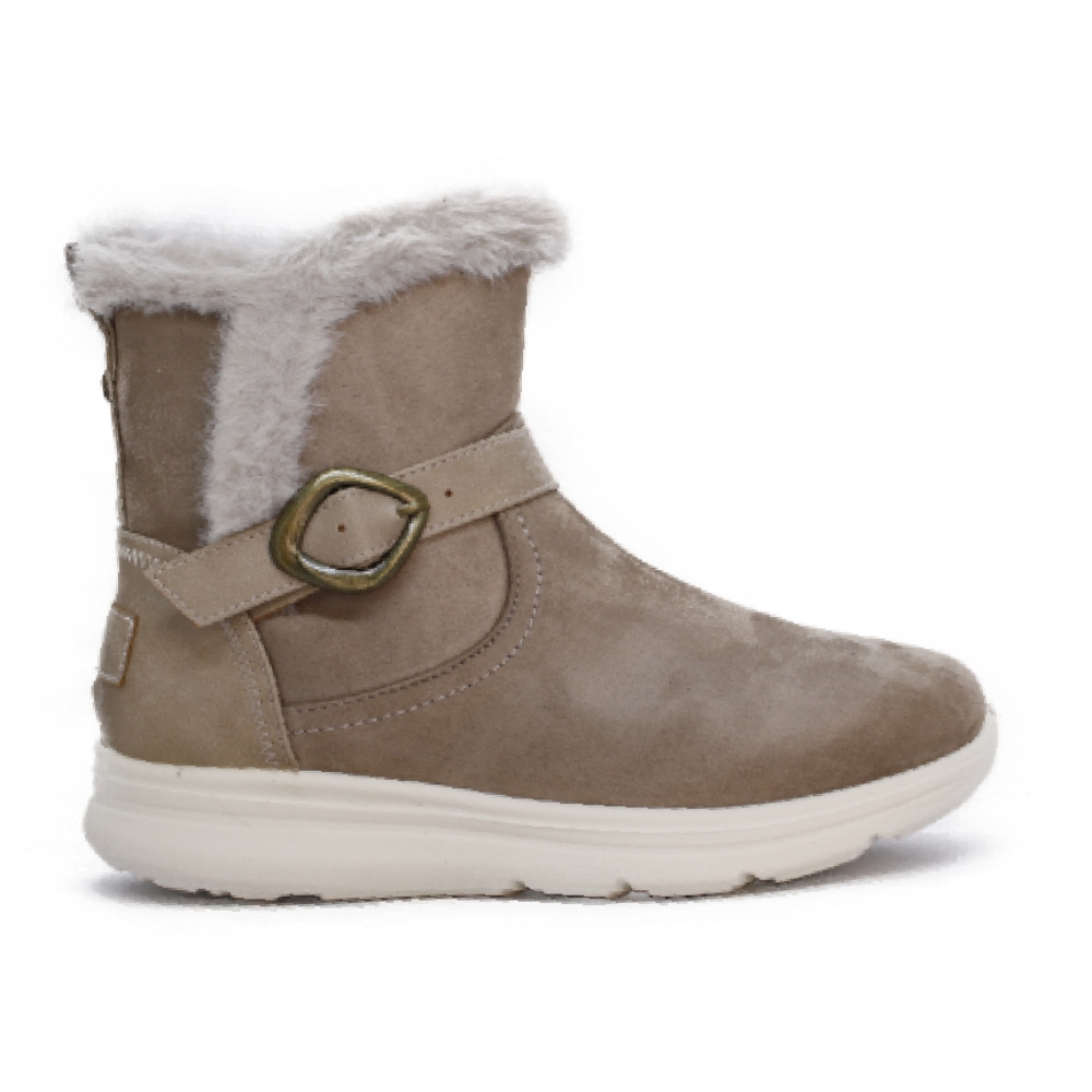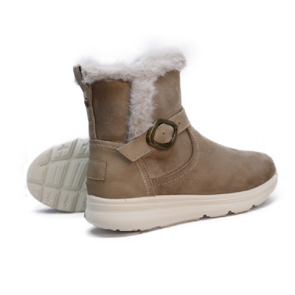 La parte superior está rematada con un suave y mullido pelo sintético en color blanco roto, que no solo decora sino que aísla el frío y proporciona una calidez superior.