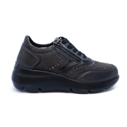 Blucher casual con cuña  para mujer en color plomo. Cierre con cremallera y cordones, altura de cuña 3 cm, zapato de estilo casual, suela extra light, material exterior sintético con forro interior textil y plantilla extraíble