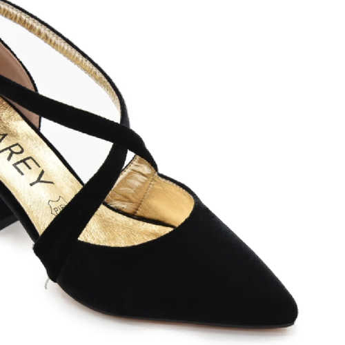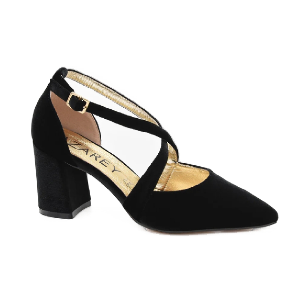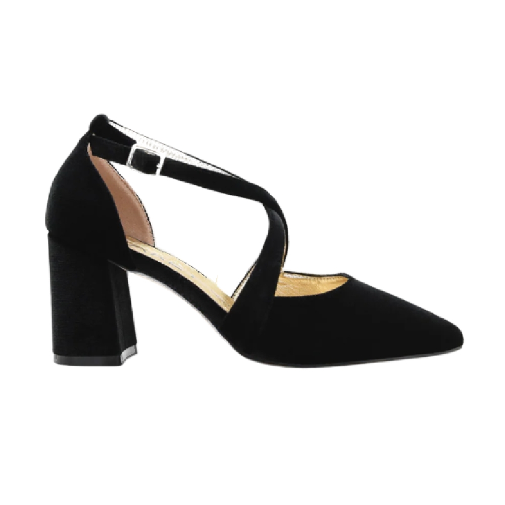 Este zapato de terciopelo negro con tacón ancho combina comodidad y elegancia. Su correa cruzada estiliza el pie, mientras la plantilla de piel acolchada asegura suavidad en cada paso. Un diseño estable y refinado para lucir con confianza en cualquier ocasión.