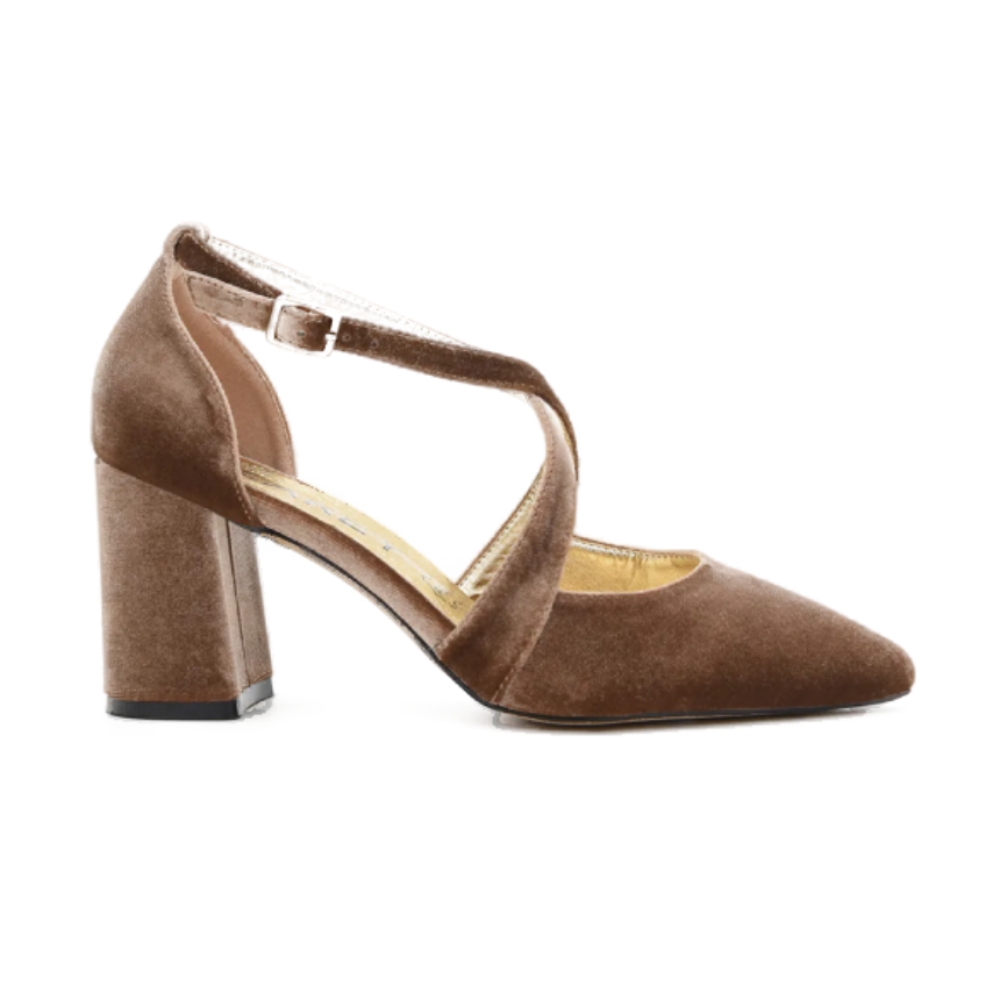 Estos zapatos de tacón ancho confeccionados en terciopelo taupe ofrecen una comodidad excepcional, gracias a su diseño estable y su planta acolchada interior de piel. Las finas tiras cruzadas al tobillo realzan el diseño elegante, aportando un toque moderno y femenino que combina seguridad y estilo en cada paso.