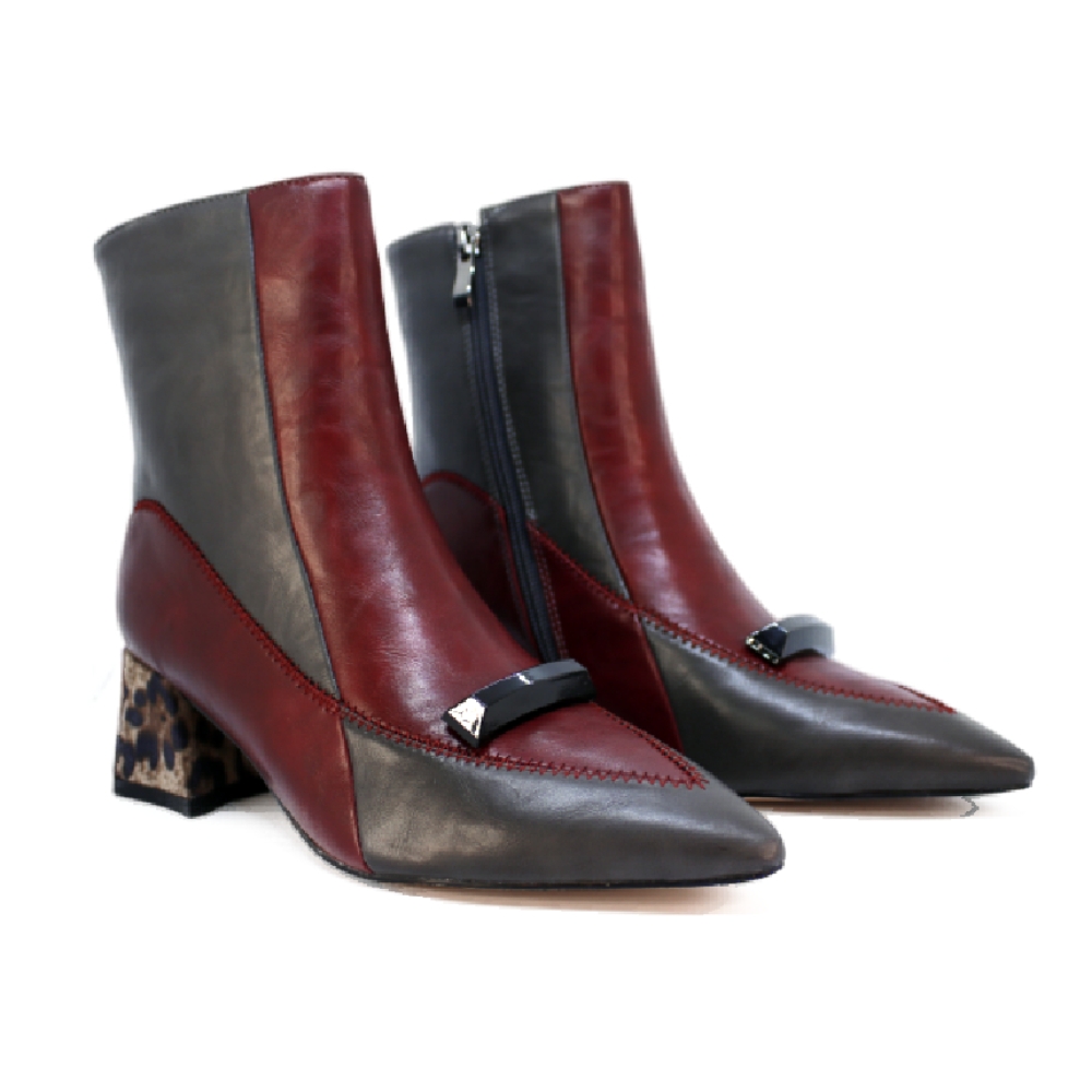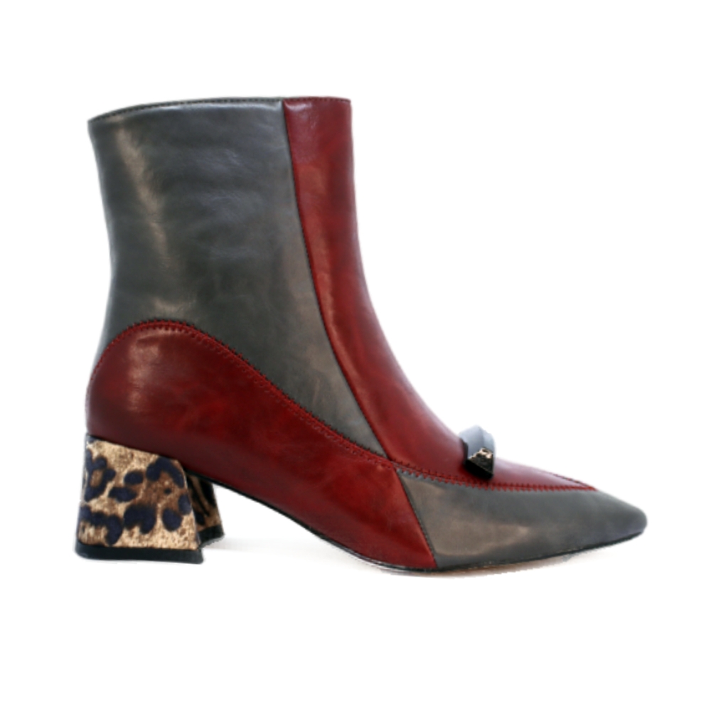 Este botín bicolor en tonos gris y granate es pura expresión de estilo y carácter. Con un diseño geométrico que alterna paneles en material sintético efecto piel, incorpora un elegante detalle en la pala: una pieza decorativa negra que añade un toque sofisticado y moderno.