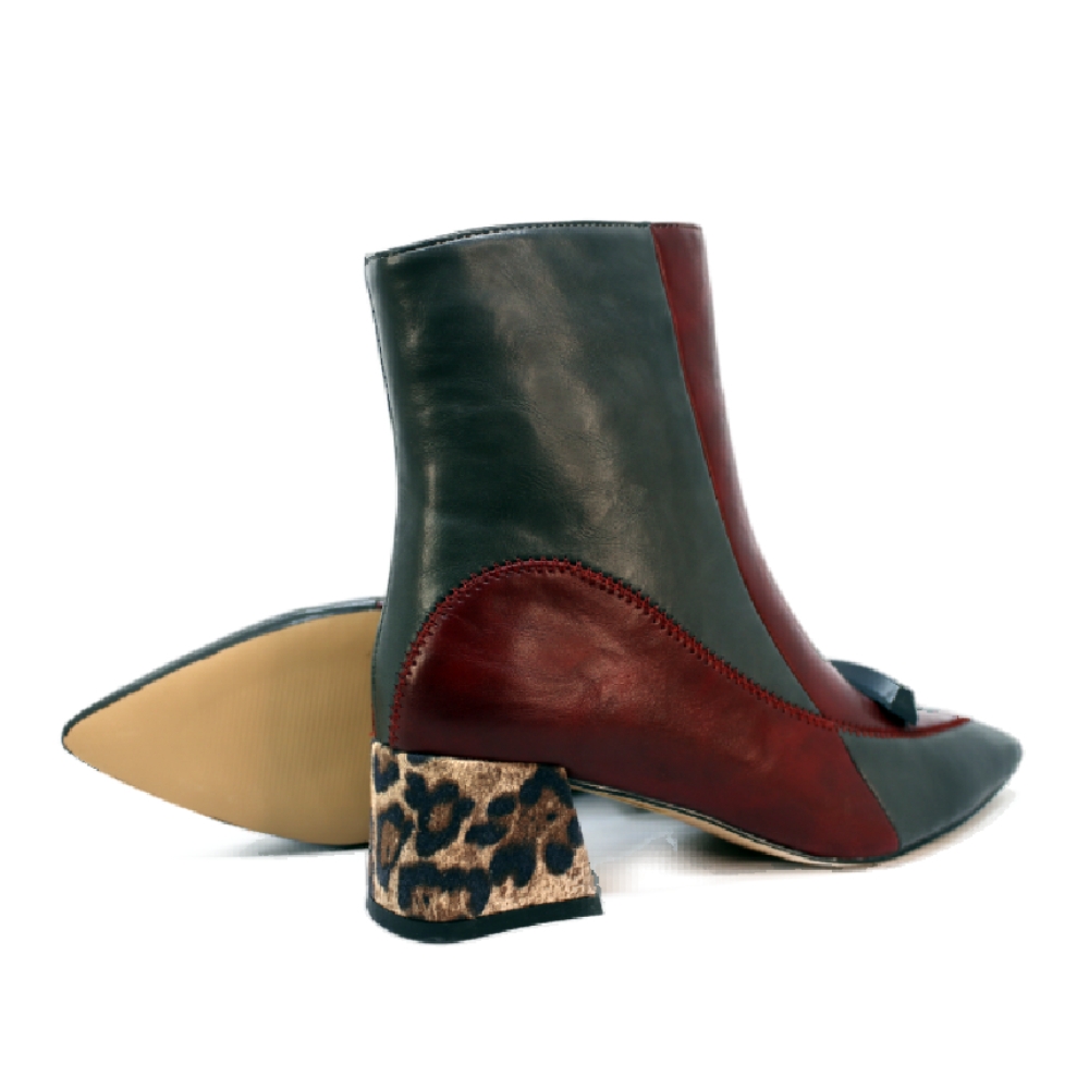 El gran protagonista es su tacón ancho forrado en estampado leopardo, que rompe con lo clásico y convierte este botín en una opción versátil y con mucha personalidad. Su punta fina estiliza la silueta del pie, mientras que la cremallera lateral interior facilita el ajuste.