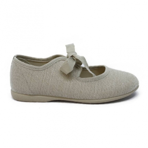 Merceditas de lino para niña. Bailarina de vestir con cierre de cintas. Color taupe. Fabricados en material textil con suela de caucho natural antideslizante. Ideal para comuniones y celebraciones. Hec