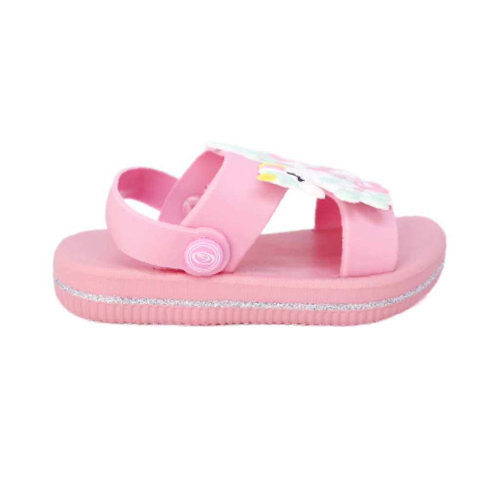 Chancla goma niña con tira de quita y pon según necesidades. Realizadas en suave goma y con una imagen de unicornio en la pala.