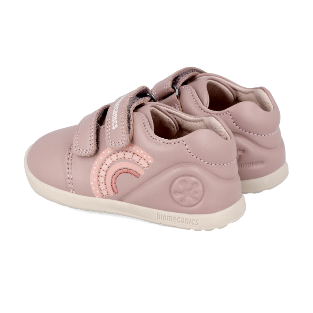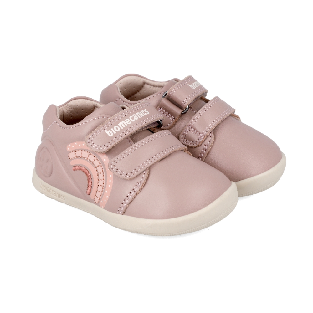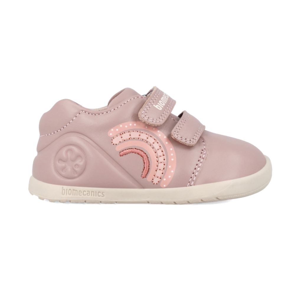 Botas para niña de la firma Biomecanics. Zapato confeccionado con materiales de excelente calidad y costuras suaves para que la pequeña sienta la mayor comodidad en su etapa preandante. Color rosa maquillaje con precioso detalle de arcoiris bordado en el lateral.