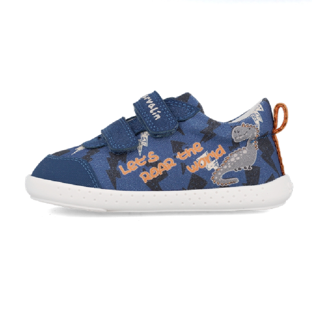 Deportivas preandante.Fabricadas en un acabado en suave tejido con divertidos estampados de dinosaurios en tonos azules y naranjas. Costuras reforzadas y bordes acolchados. Se cierran con doble tira de velcro que aseguran el cierre del zapato y dotan de gran comodidad para abrochar y desabrochar. Suela fabricada con suave material que evita posibles rozaduras y se adapta al pie del niño. Puntera cerrada que protege sus dedos.