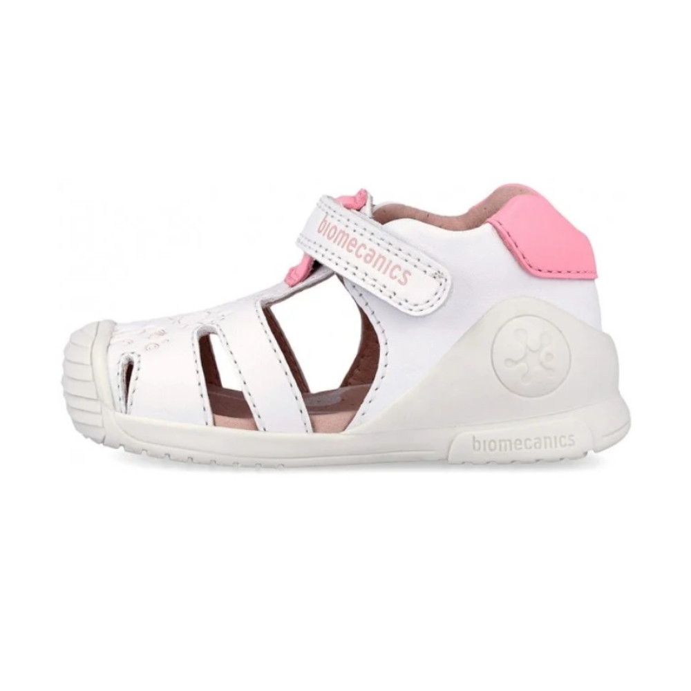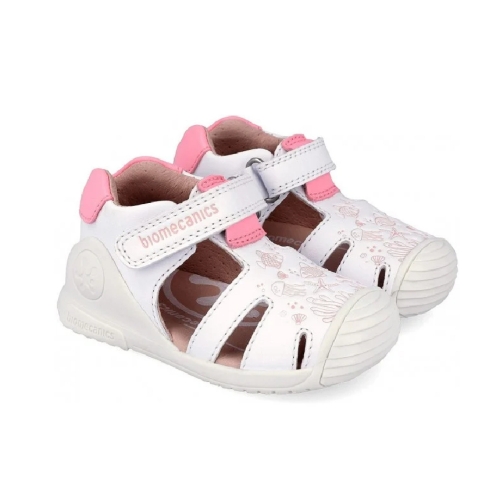 Sandalia de niña en piel con grabado oceano. Estabilizador externo diseñado para proteger sin sobreproteger en entornos no controlados con libertad de movimiento, blandito y flexible. Puntera redonda y reforzada para una mayor durabilidad. Plantilla plana sin arco plantar y transpirable. Cierre con tira adherente.