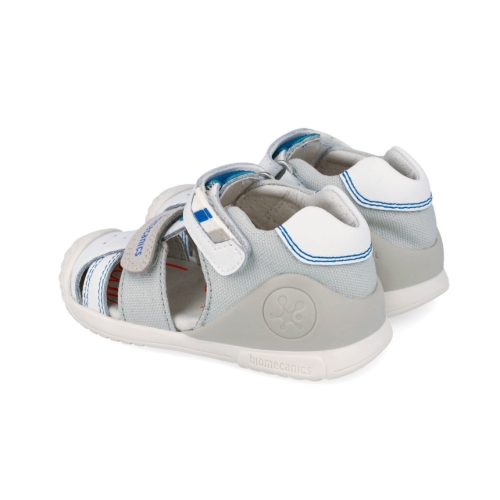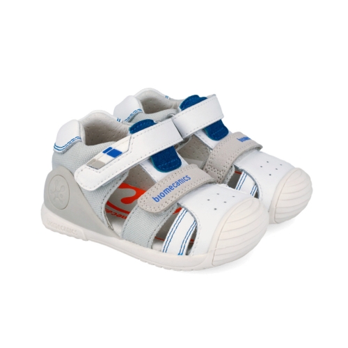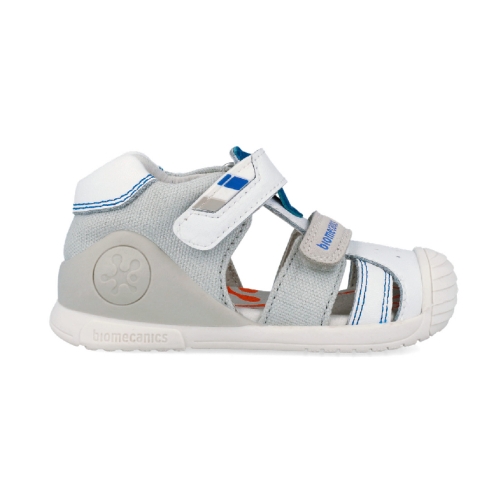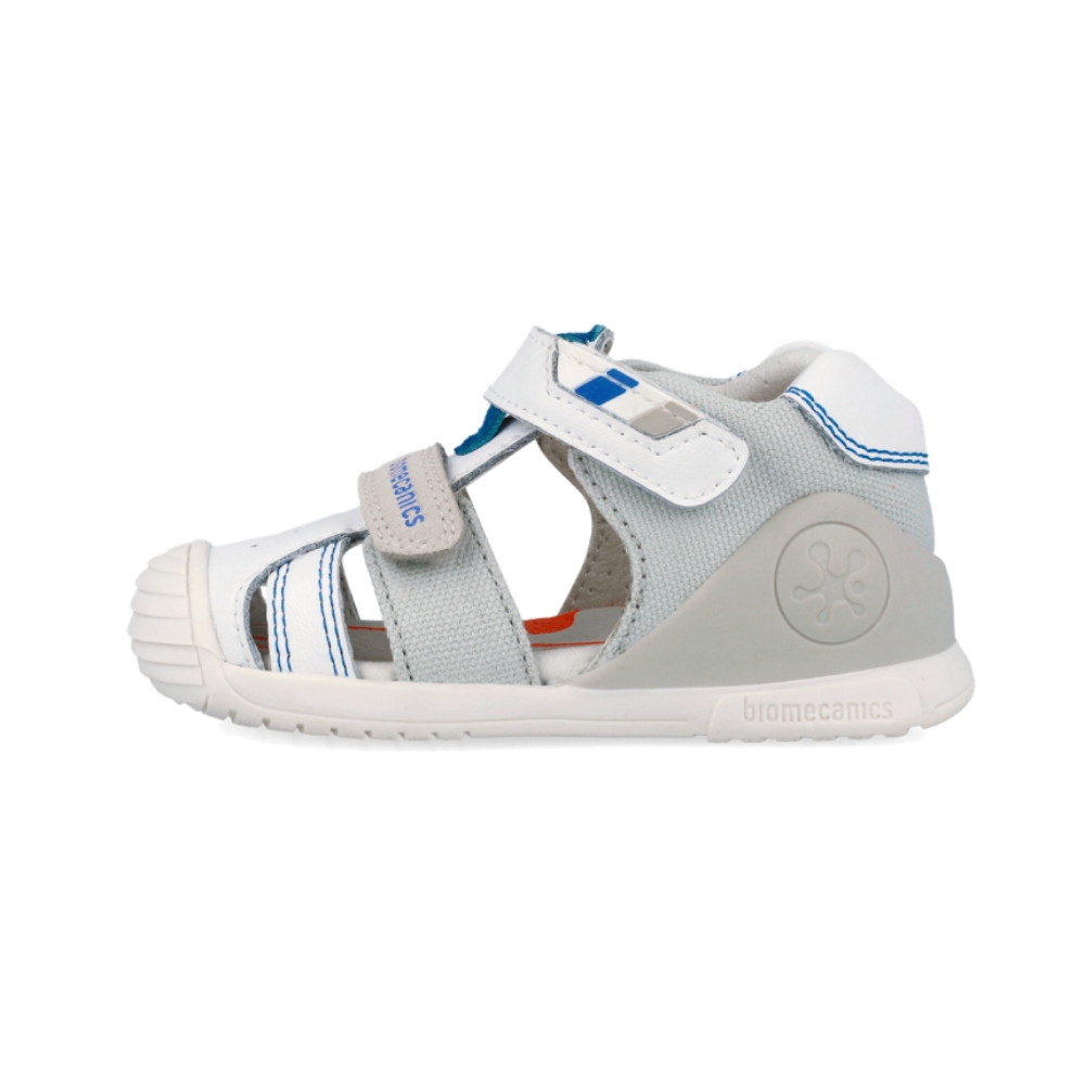 La sandalia Biomecanics 262123-B en color blanco con detalles en gris es el calzado ideal para los primeros pasos de tu bebé. Diseñada bajo la supervisión del Instituto de Biomecánica de Valencia (IBV), este modelo combina seguridad, flexibilidad y confort para acompañar el desarrollo natural del pie en sus etapas de gateo y marcha temprana.