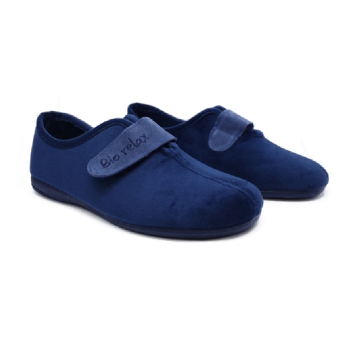 Zapatilla caballero cerrada bio relax, color azul, con cierre adherentepara calzarse facilmente, horma ancha, especial pies con problemas. Hecha en España con paños muy calidos y suaves, piso caucho natural con  una gran elasticidad antideslizante. Admite lavadora.