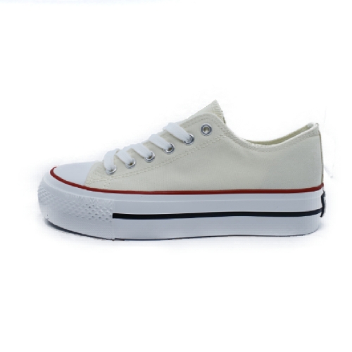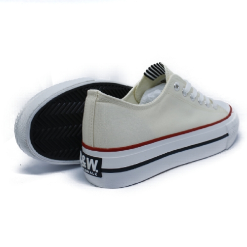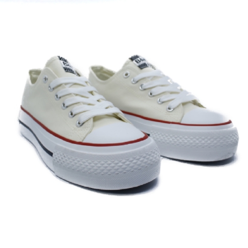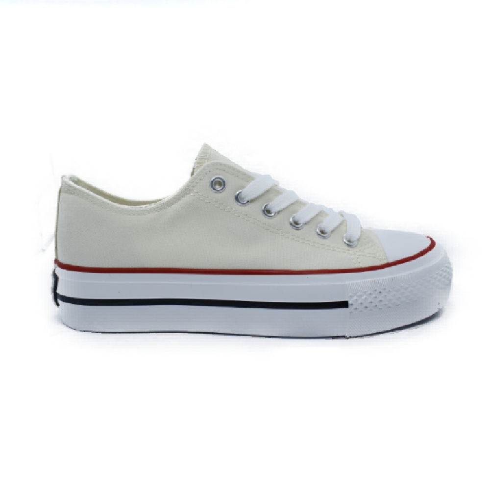 Zapatillas lona beige con puntera. Este modelo está construido en textil lona en tono beige. Suela de goma blanca y lettering personalizado en el talón. Presenta una altura de 4 cm y cuenta con el emblema de nuestra bandera en el lateral.