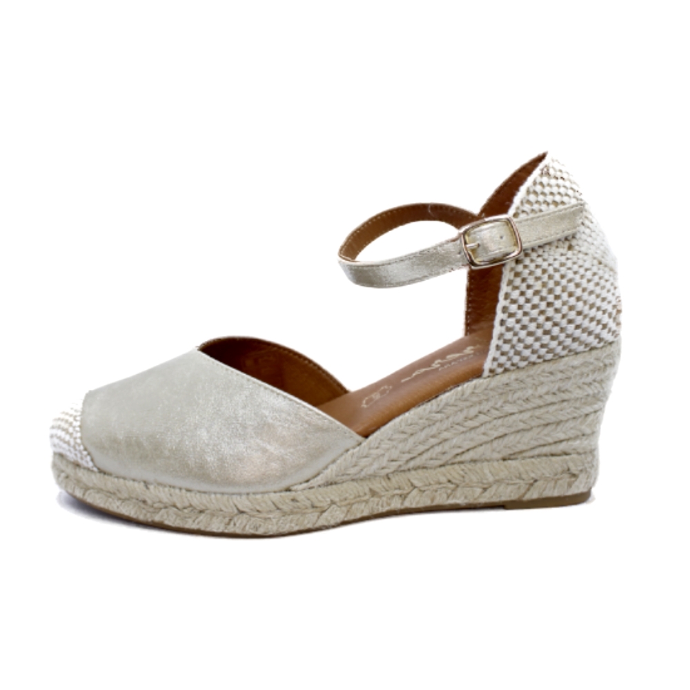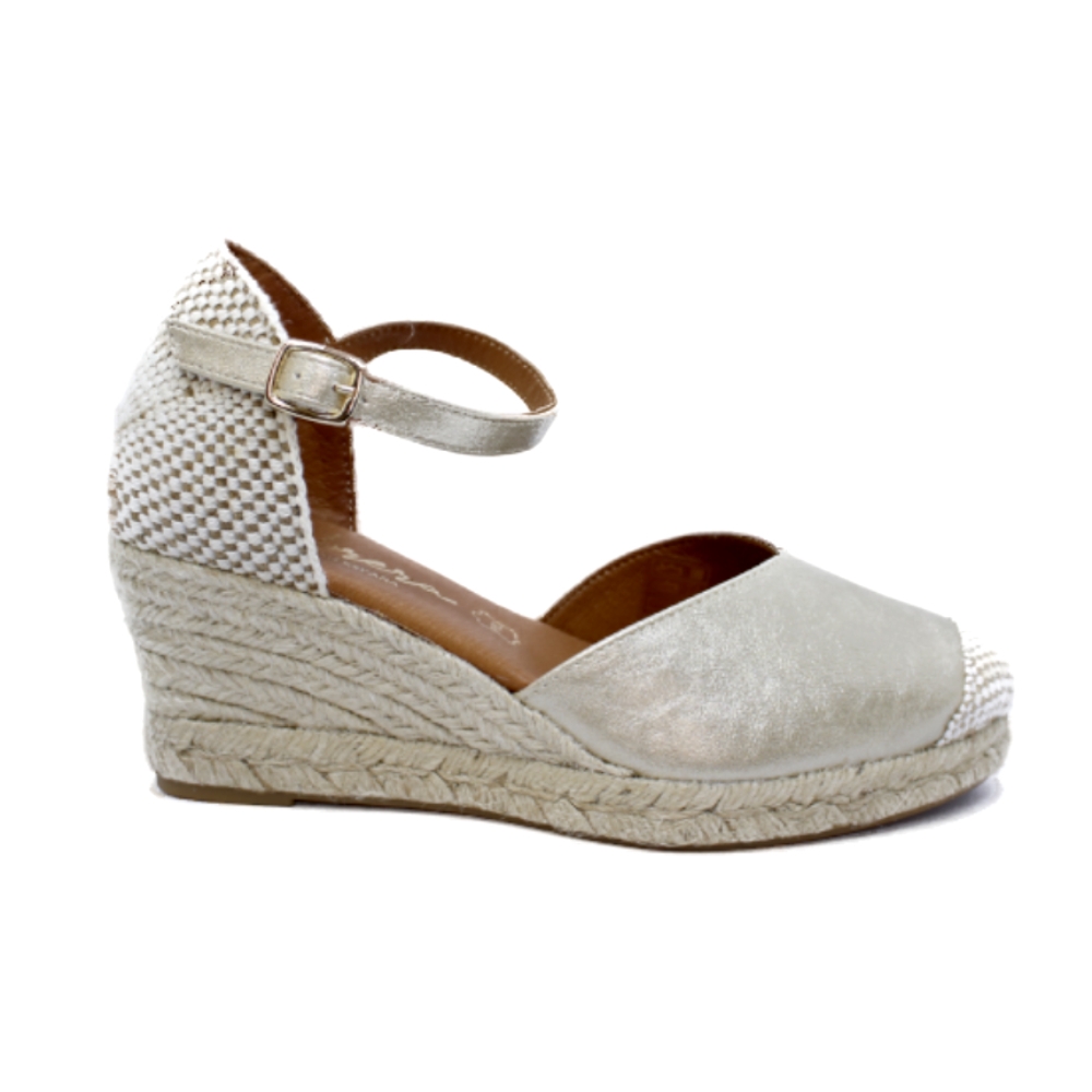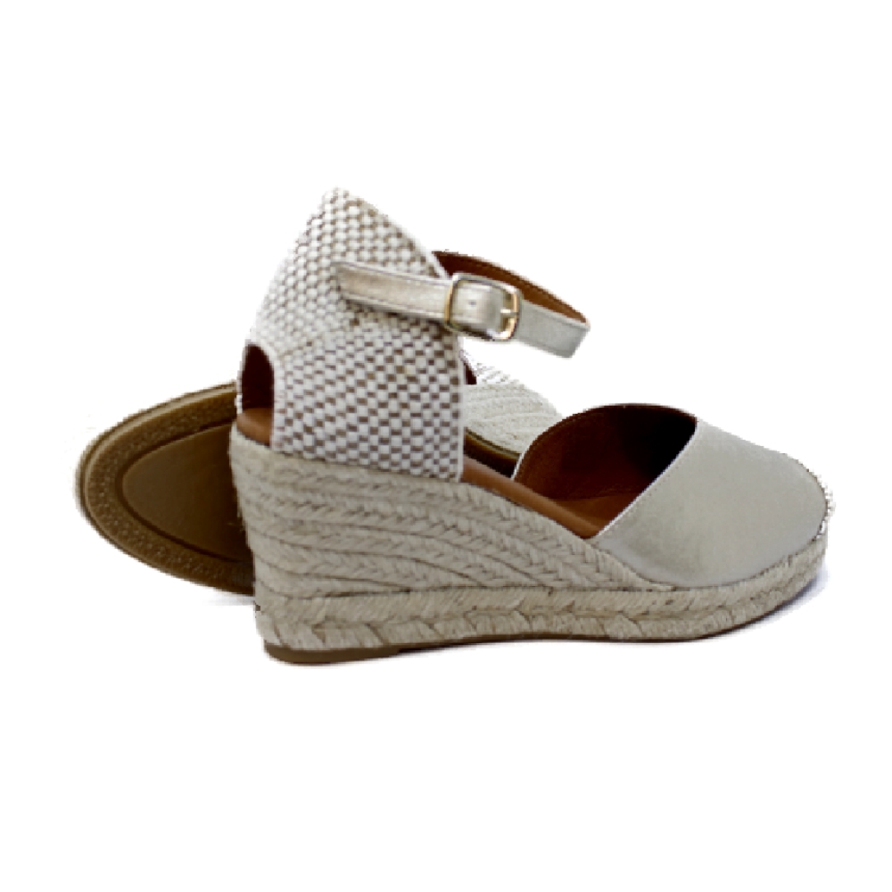 Color platino (champan). Cuña de esparto de 5 cuerdas (altura trasera de la cuña 7 cm aprox. y 2 cm en la parte delantera).Planta acolchada de PIEL. Piso fino de goma antideslizante terminado en forma de pequeño tacón.