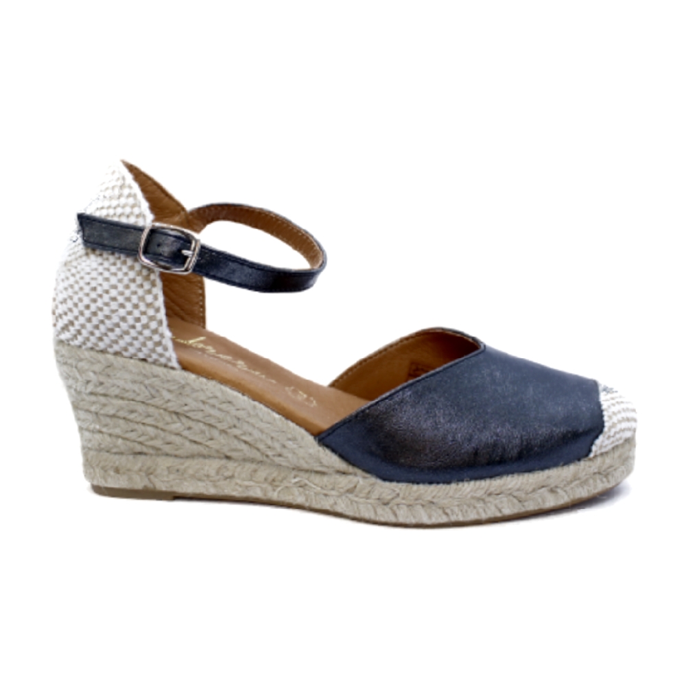 Sandalia esparteña con puntera cerrada y talonera con cierre de hebilla.