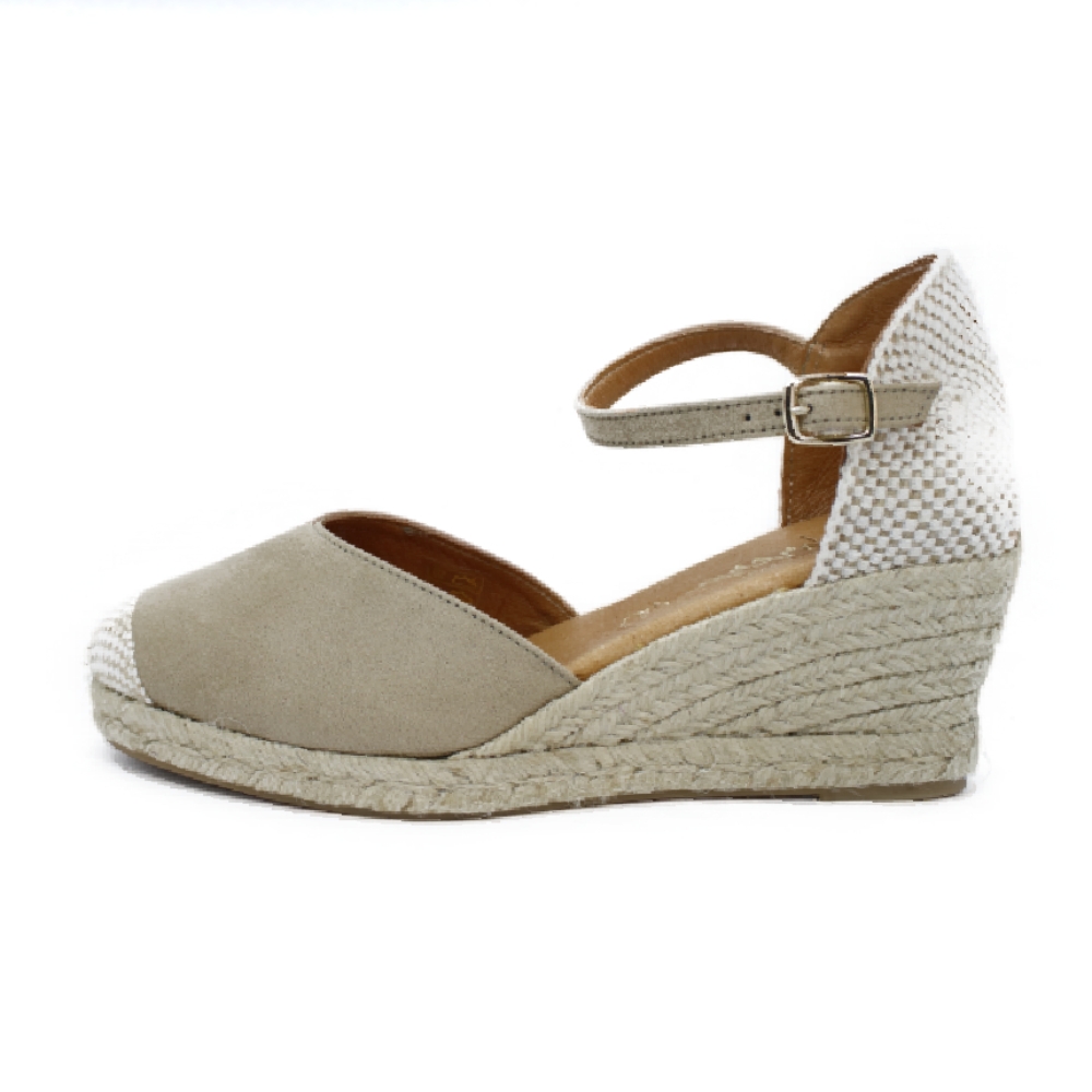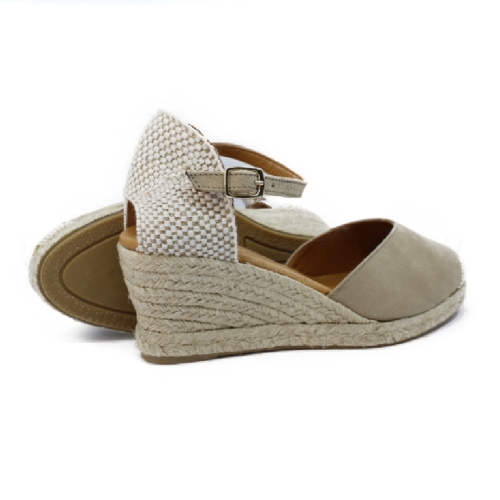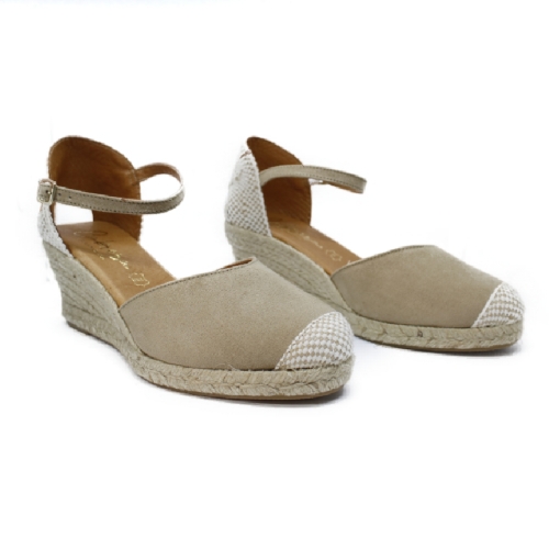 Cuña de esparto de antelina en color arena. Corte cerrado en puntera con escote en pico.  Plantilla acolchada de piel muy cómoda. Alpargata de yute media de 5 cuerdas cosida a mano.  Altura: 5 cm y 2 cm de plataforma. Modelo clásico para el verano, romerías o ferias.