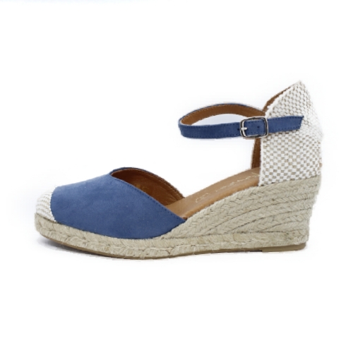 Cuña de esparto de antelina en color azul  Corte cerrado en puntera con escote en pico.  Plantilla acolchada de piel muy cómoda. Alpargata de yute media de 5 cuerdas cosida a mano.  Altura: 5 cm y 2 cm de plataforma. Modelo clásico para el verano, romerías o ferias.