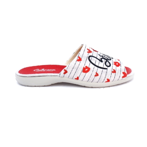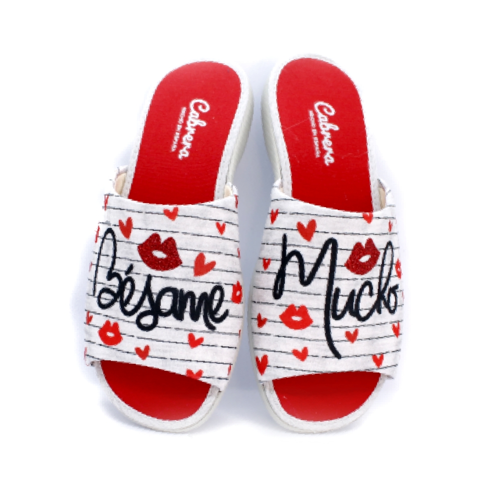 Chinela mujer realizada en suave y tranpirable tejido gris con bonitos detalles rojos y mensajer bordado. Plantilla gel muy cómoda. Suela de caucho natural y antideslizante.
