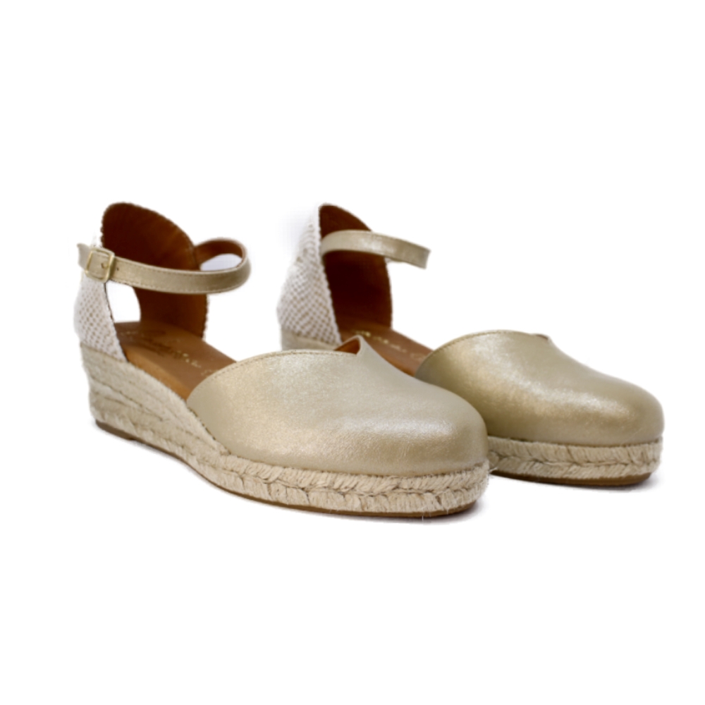 Alpargata de cuña baja de yute de 5 cm, fabricada en piel metalizada de alta calidad, con plantilla de piel acolchada, pulsera al tobillo y cierre mediante hebilla para una sujección óptima. Con puntera redondeada y escote en forma de "V" para ofrecer una imagen estilizada de nuestros pies. Comodidad, durabilidad y versatilidad de un calzado 100% español.