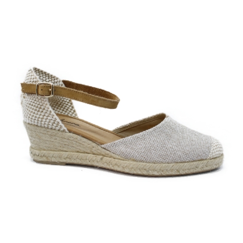 Cuña de esparto de lino en color plata. Corte cerrado en puntera con escote en pico.  Plantilla acolchada muy cómoda. Alpargata de yute media de 4 cuerdas cosida a mano.  Altura: 4 cm y 2 cm de plataforma. Modelo clásico para el verano, romerías o ferias.