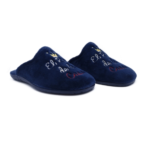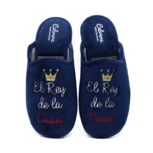 Zapatilla destalonada de casa en color azul marino "El rey de la casa". Fabricadas en España con materiales de gran calidad. Suela de caucho antideslizante.