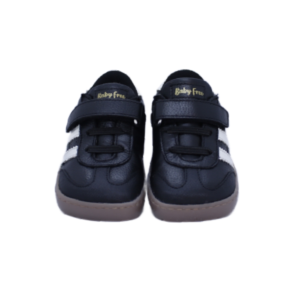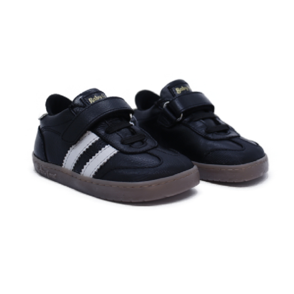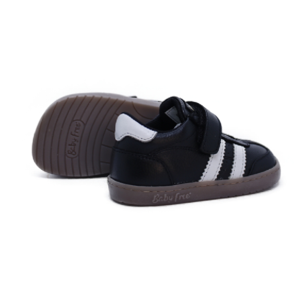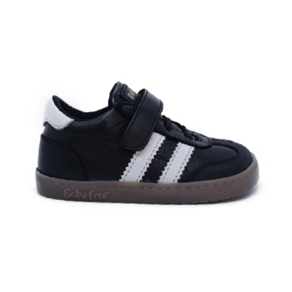 Zapatillas deportivas para bebé respetuosas tipo barefoot con drop 0, de gran versatilidad para sus aventuras diarias. Material exterior combinado de piel y serraje. Todos nuestros zapatos se realizan con pieles libres de cromo. Forro interior y plantilla de algodón transpirable. Suela de caucho ligera y flexible. Cierre con tira ajustable que garantiza una perfecta sujeción del pie.
