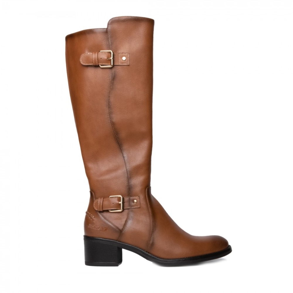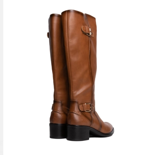 Bota alta de señora color cuero. Corte clásico caballista con doble tira con hebilla. Material efecto piel cepillada. Cremallera interior y punta almendrada. La suela tiene un pequeño tacón, es de color marrón y acabado antideslizante.