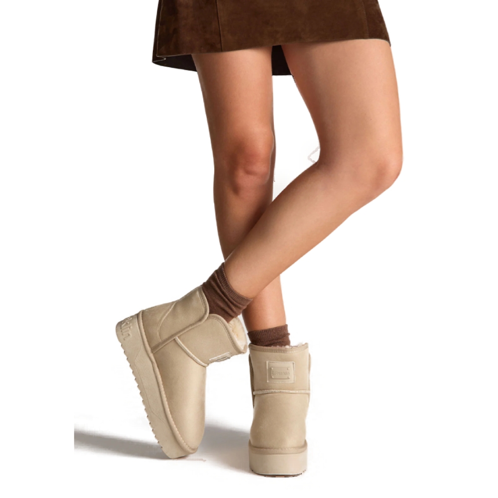 Botas australianas beige con plataforma de corte bajo. Nuestra cápsula de invierno desciende de las laderas hacia tus outfits. Un diseño con estética après-ski concebido para los días más fríos.