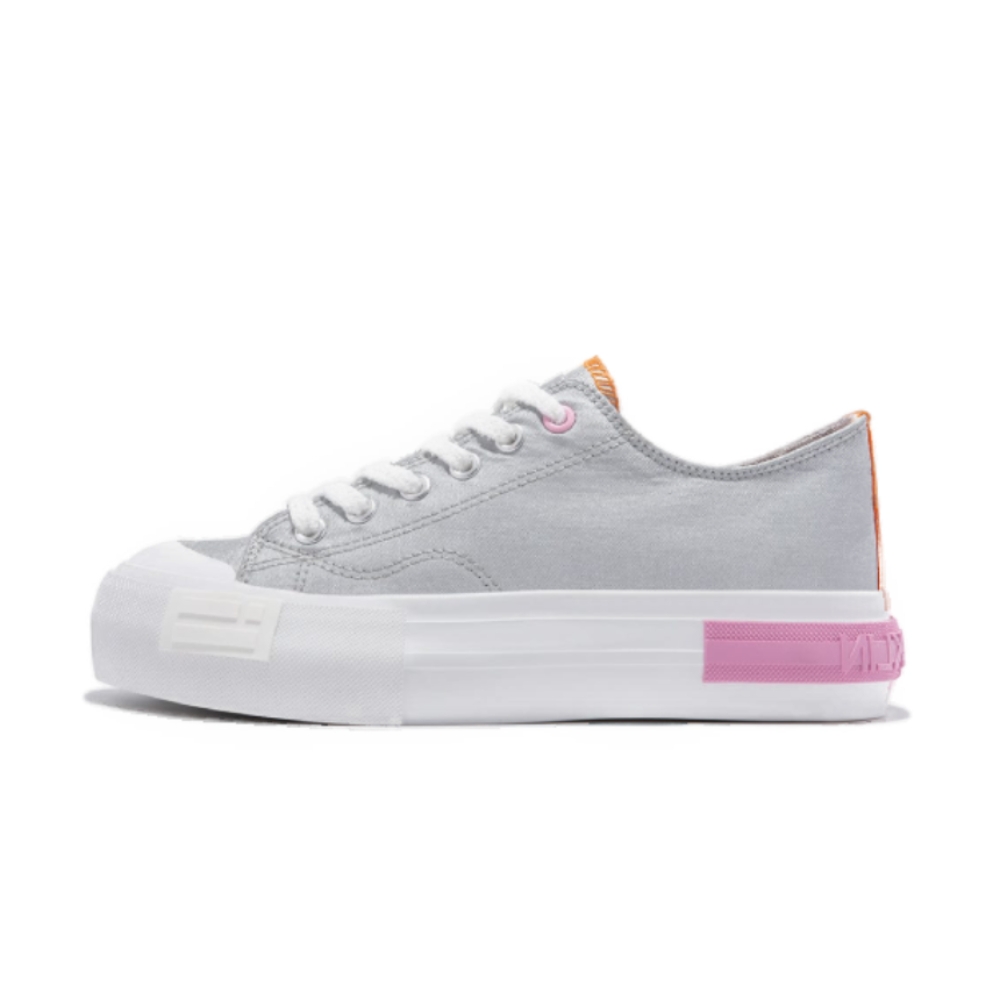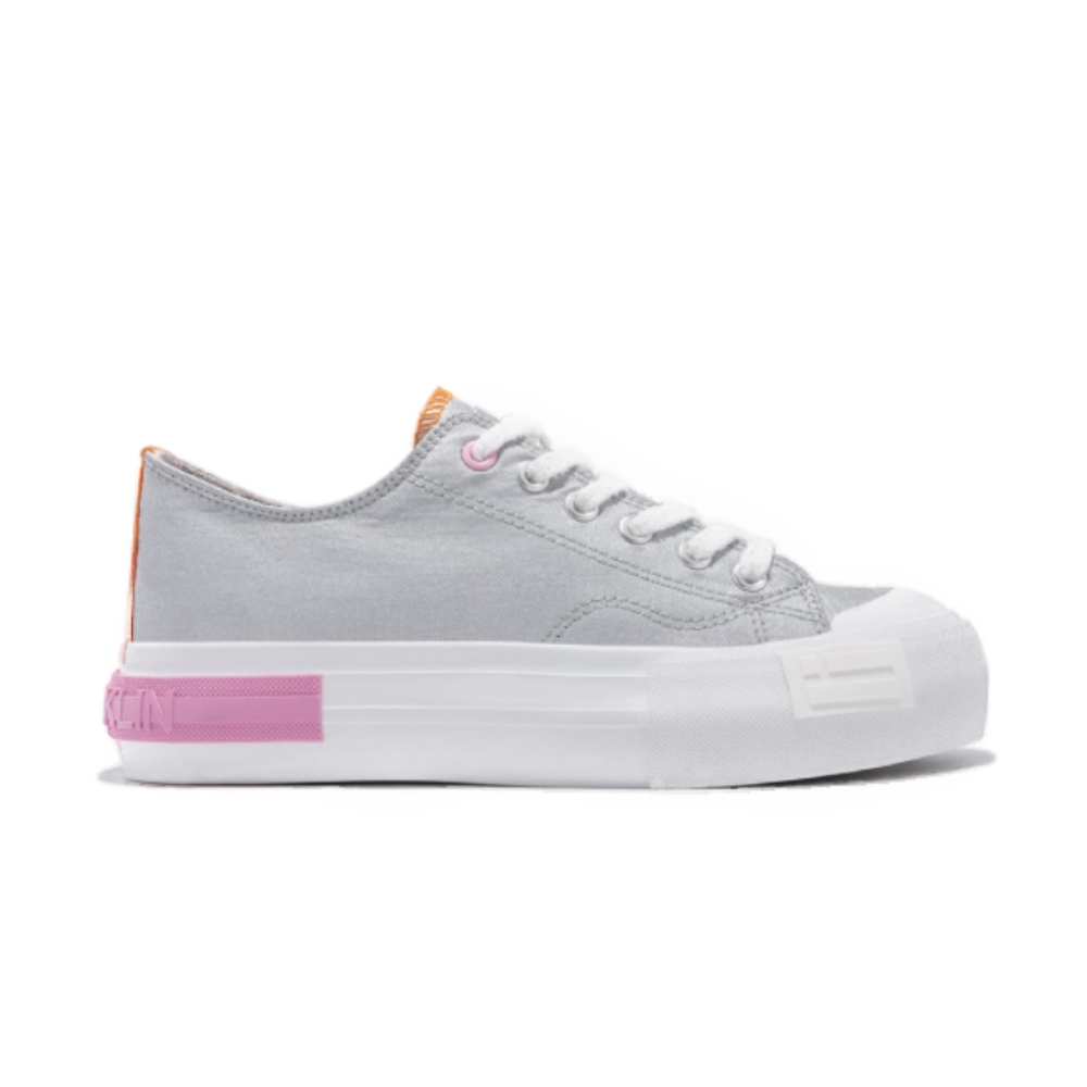 Nuestro diseño One Way plateado está confeccionado en textil lona. Suela de goma blanca y detalle de lettering rosa. Presenta una altura de 4 cm y cuenta con el emblema de nuestra bandera en el lateral.