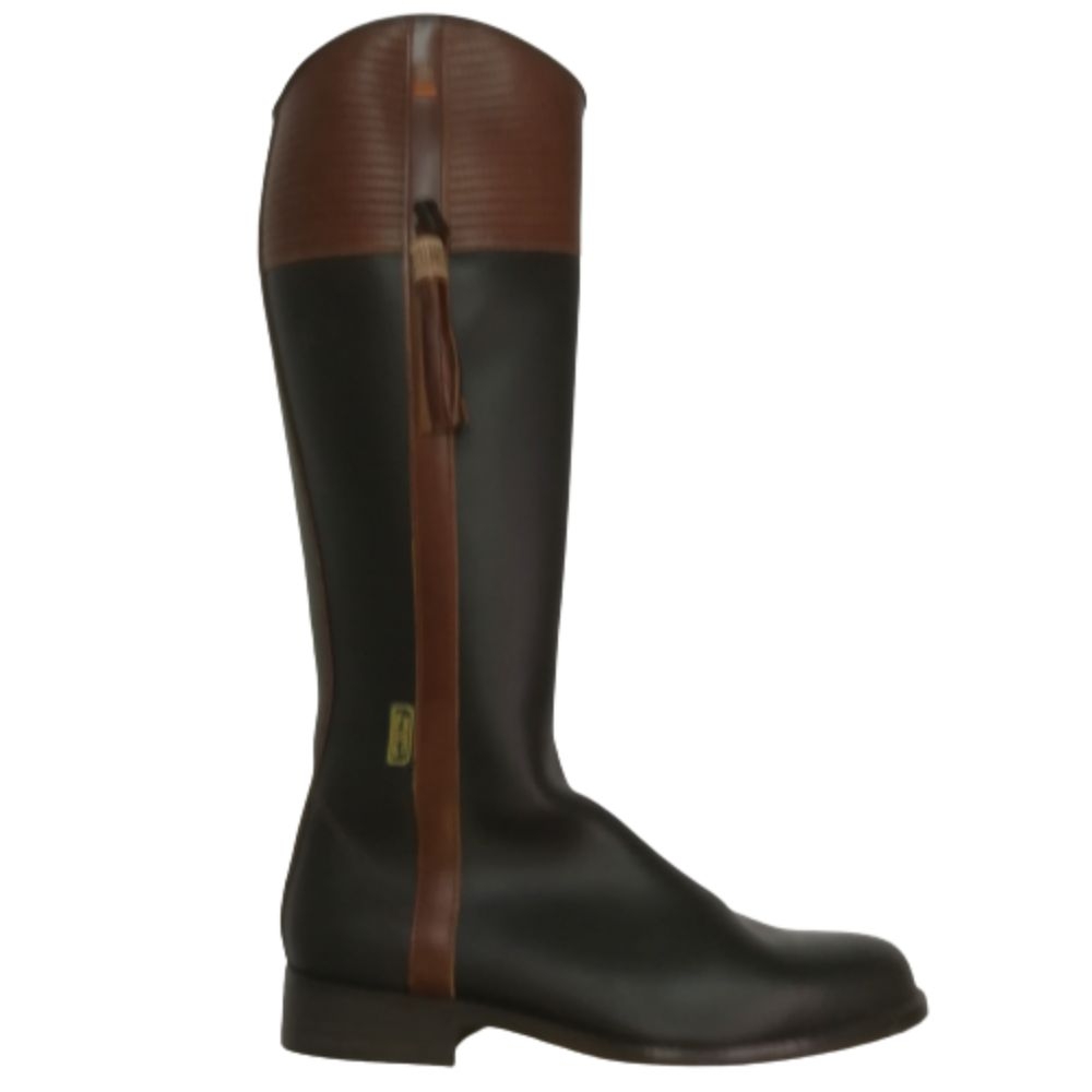 Bota campera mujer inspiración hípica, piel engrasada, color marrón oscuro con detalle cuero viejo y borlas , con cremallera interior y adorno bordado. 100 % Made in Valverde. Altura caña 42 cm