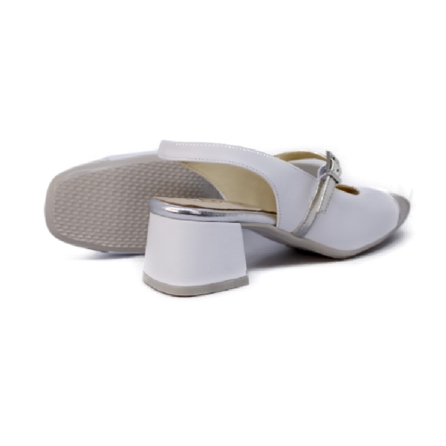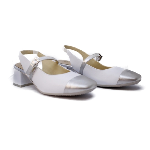 Su tacón de 4 cm ofrece la altura justa para estilizar la figura sin sacrificar comodidad, mientras que la correa ajustable garantiza un ajuste seguro y personalizado. Su acabado en tonos blancos y plateados lo convierte en una opción versátil, perfecta para combinar con looks formales y semi-casuales.
