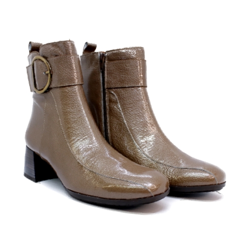 Botín de mujer realizado en piel acharolada de color taupe con un cómodo tacón de 6 cm que te proporcionará estabilidad al andar gracias a su anchura. Suela de goma antideslizante, flexible y ligera gracias a la tecnología  TOTAL FLEX.