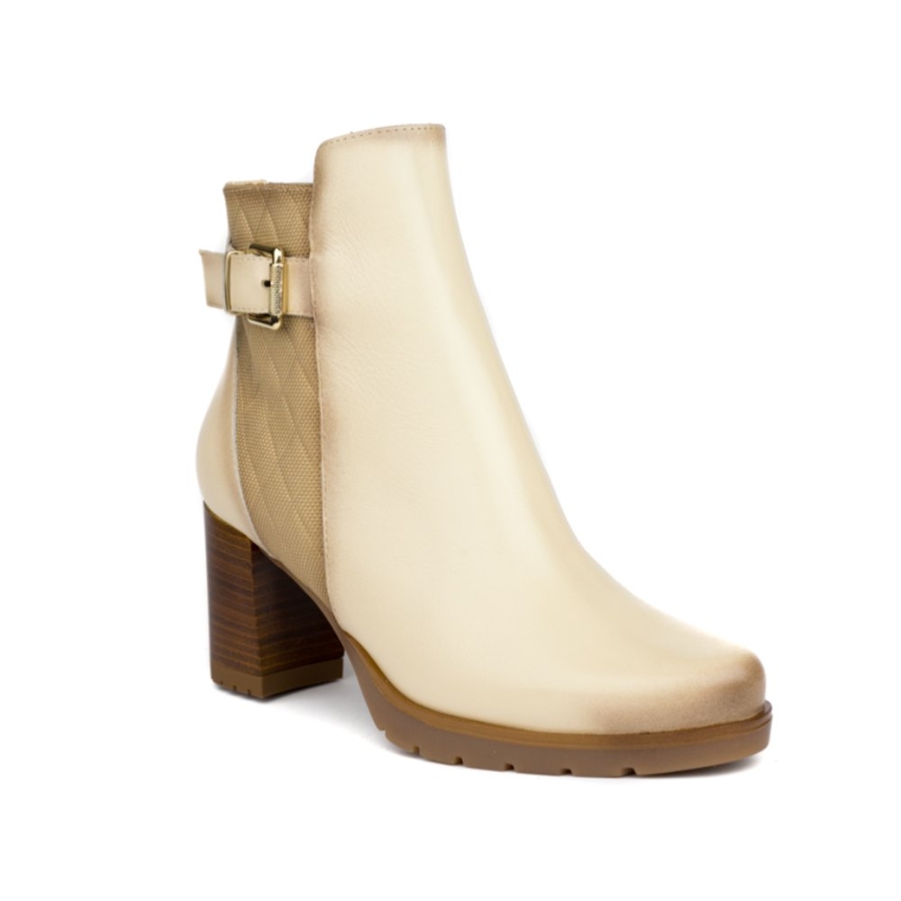 Botines con hebilla Desireé Leury 11 para mujer en color beige, con cremallera, tacón 7 cm, suela de goma termoplástica, exterior de piel y plantilla textil. Su diseño delantero hace que los dedos vayan cómodos en todo momento. Especial refuerzo de gel en los metatarsos. Suela flexible antideslizante que lo convierten en un botín ideal para el frio y la lluvia