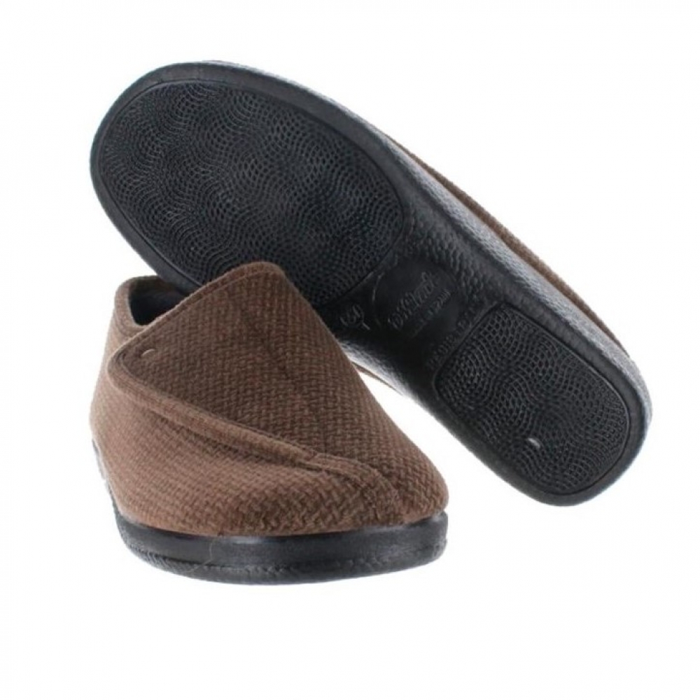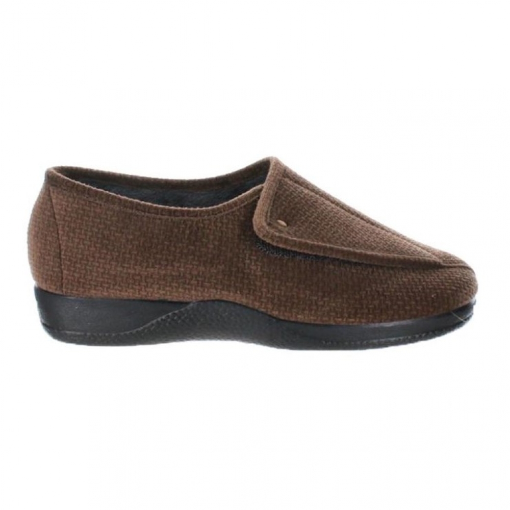 Zapatilla  marrón de mujer realizad en paño suapel que incorpora una lengüeta de velcro que la abre  totalmente permitiendo una acceso fácil a cualquier pie. Su ancho especial la hace totalmente recomendable para pies hinchados y diabéticos. No tiene ninguna costura en su interior que moleste. El tejido es termoaislante y antibacteriano. la suela de goma antideslizante tiene una altura máxima de 2 cm. Admite lavadora.