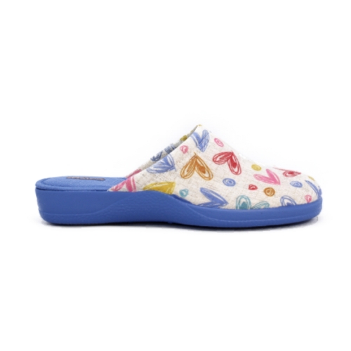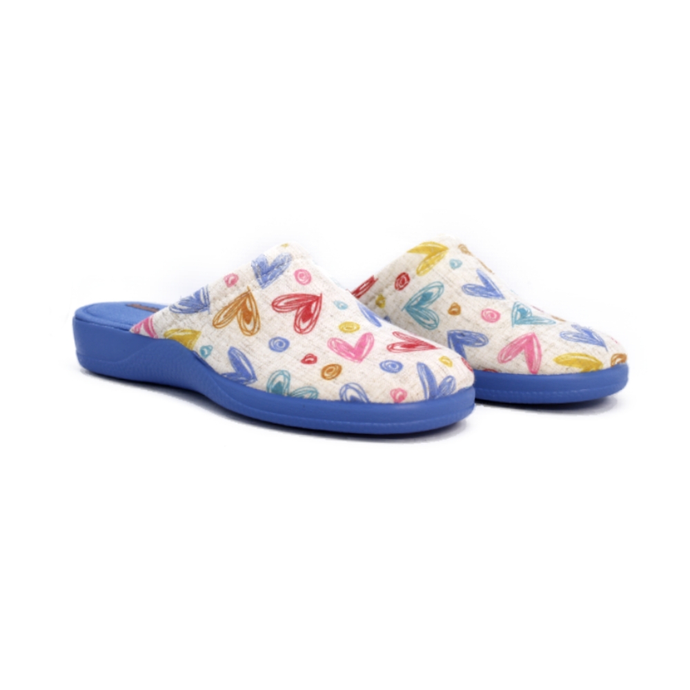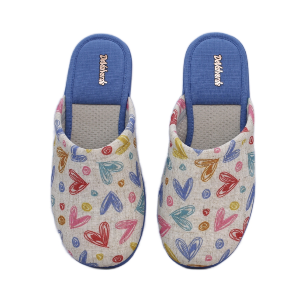 Zapatillas de estar en casa para mujer de la marca DeValverde, con puntera cerrada y un estampado de corazones en alegres tonos azules rojos y amarillos